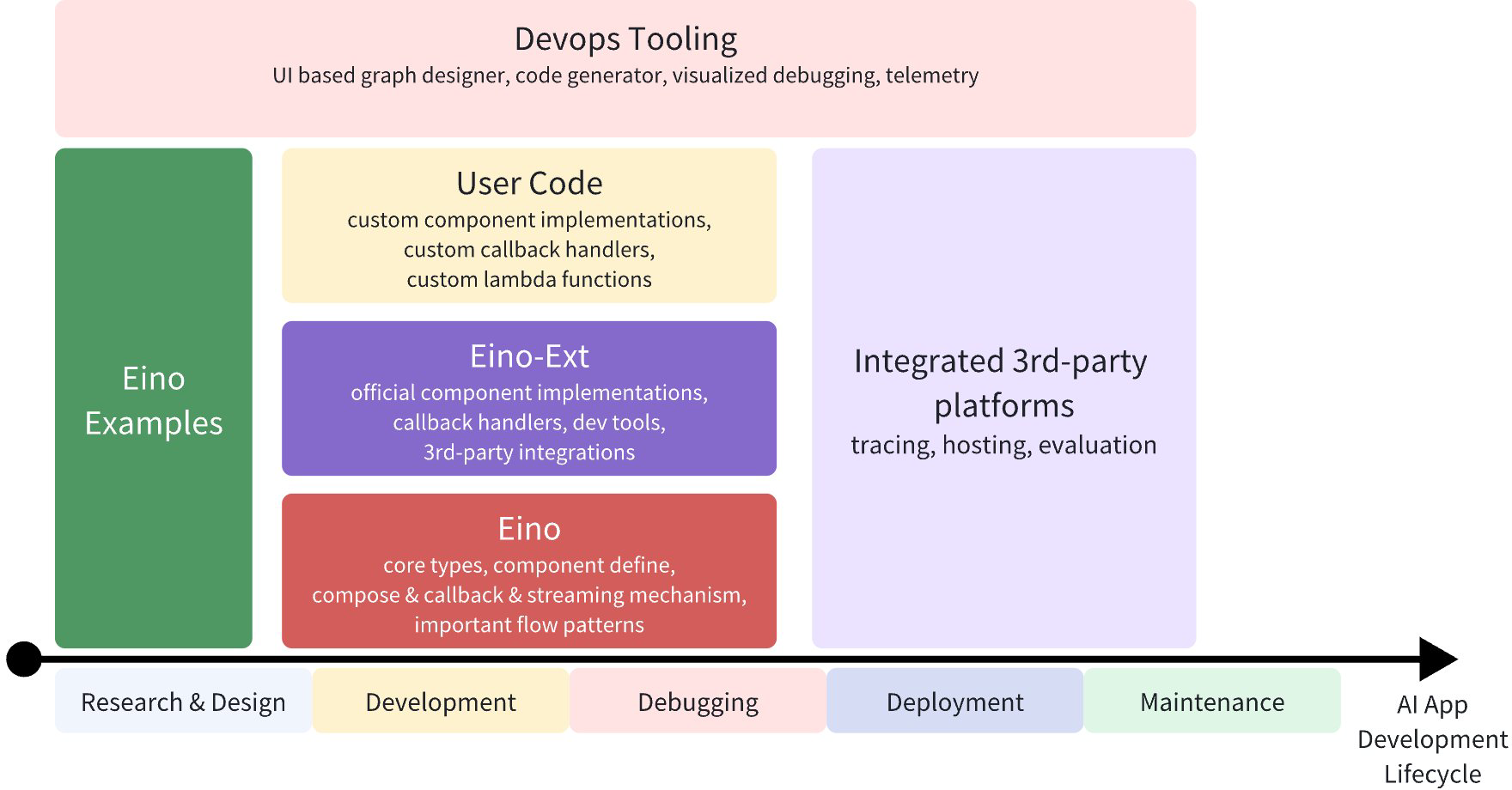With the above capabilities and tools, Eino can standardize, simplify operations and improve efficiency at different stages of the artificial intelligence application development lifecycle: