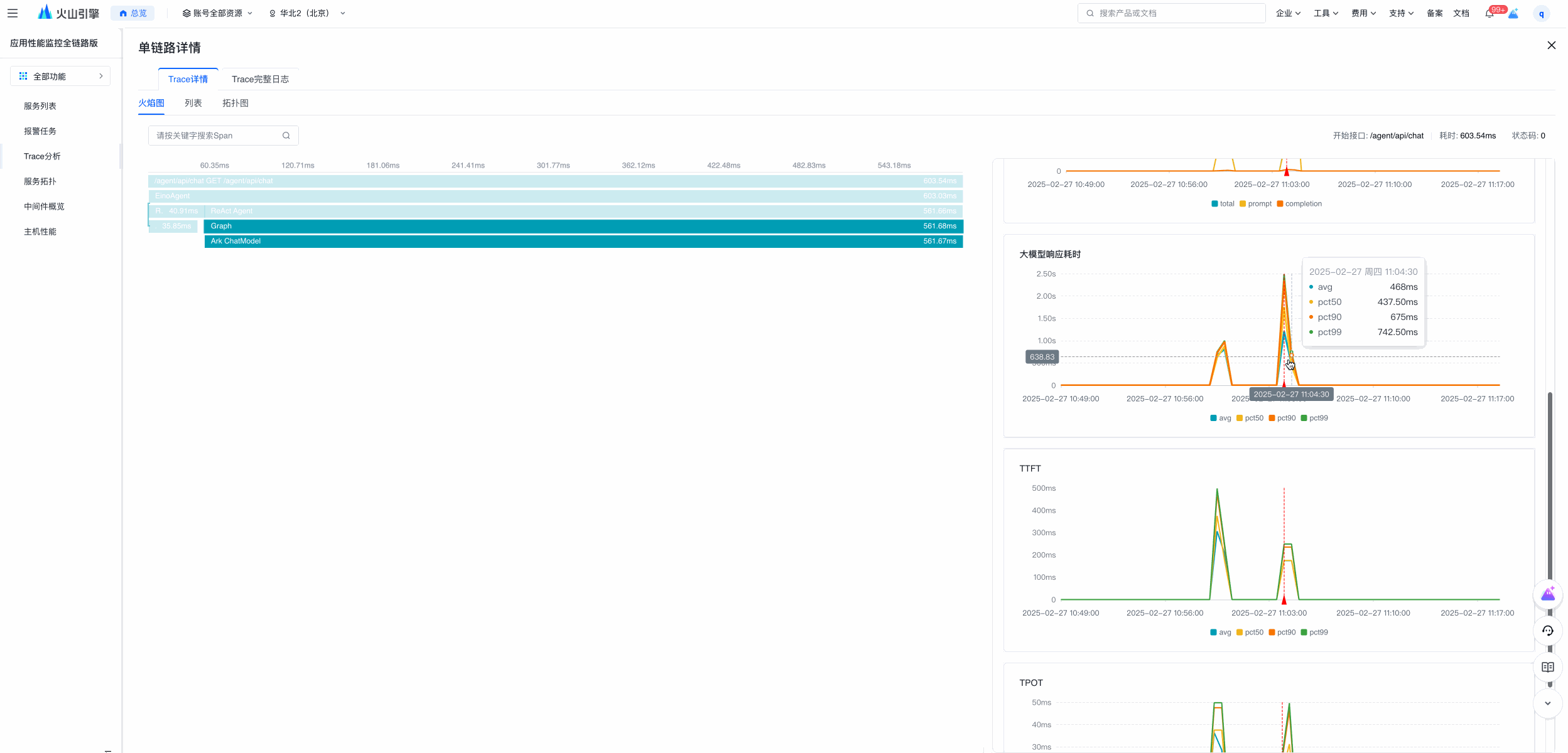 If you specify APMPLUS_APP_KEY in the .env file during runtime,you can log in to the corresponding account on the Volcengine APMPlus platform to view the trace and metric details of the requests.