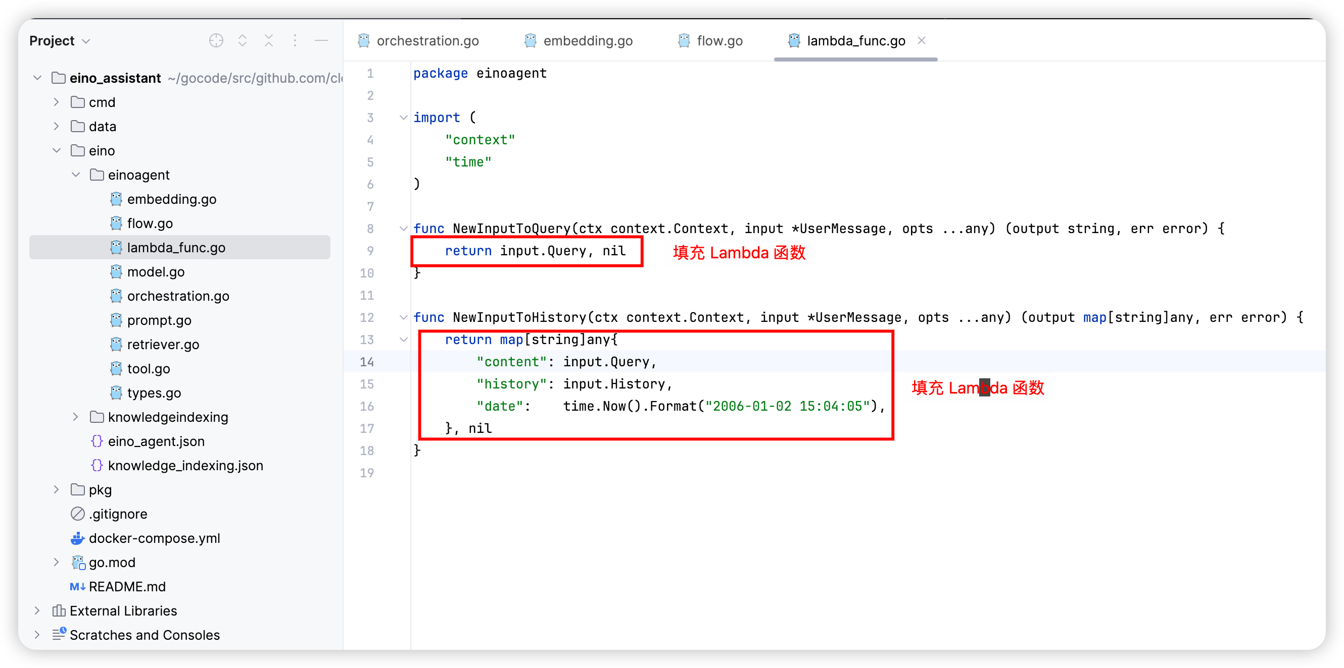 Once the configuration content for the components is supplemented, you can call the BuildEinoAgent method to use it in the business scenario.