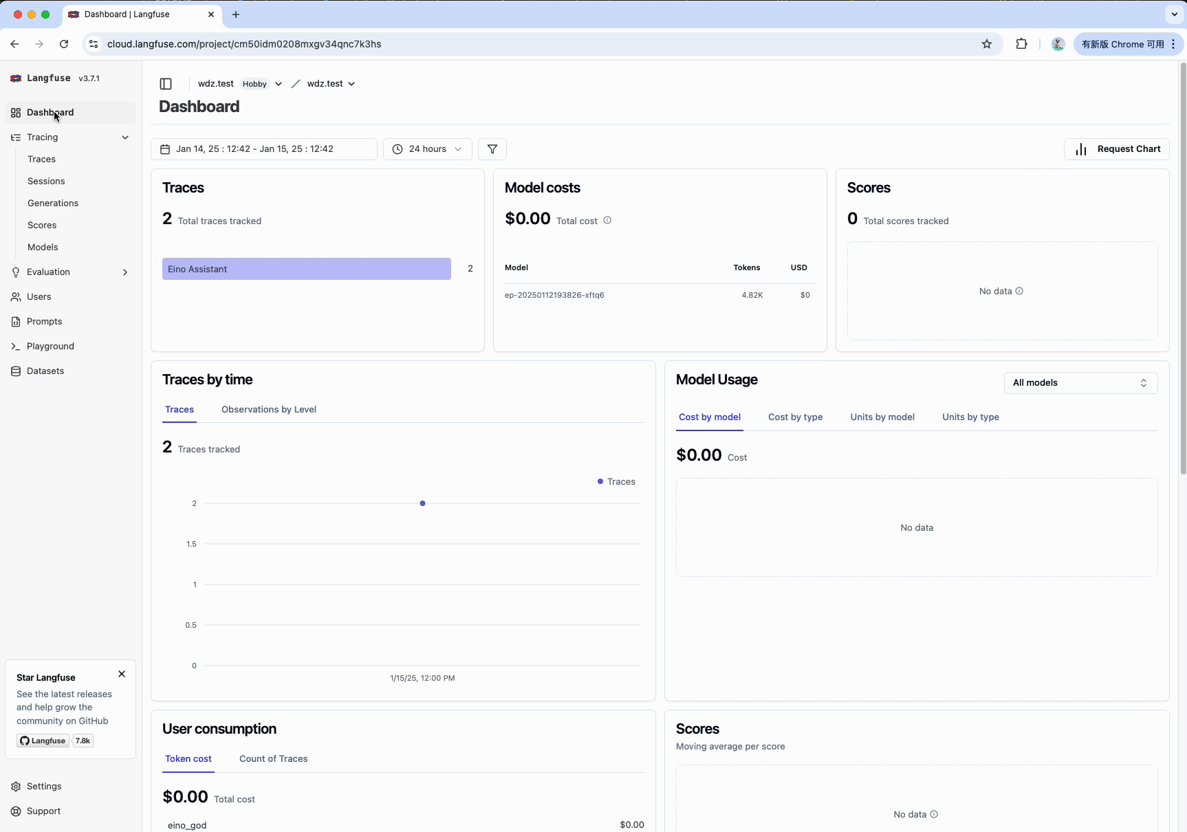 If you specify LANGFUSE_PUBLIC_KEY and LANGFUSE_SECRET_KEY in the .env file during runtime, you can log in to the corresponding account on the Langfuse platform to view the trace details of the requests.